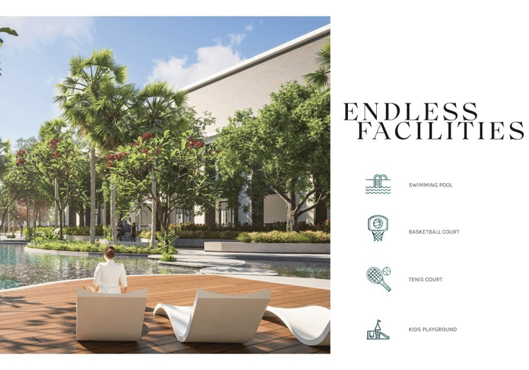 Memiliki fasilitas terbaik, swimming pool, basketball court, tennis court, kids playground